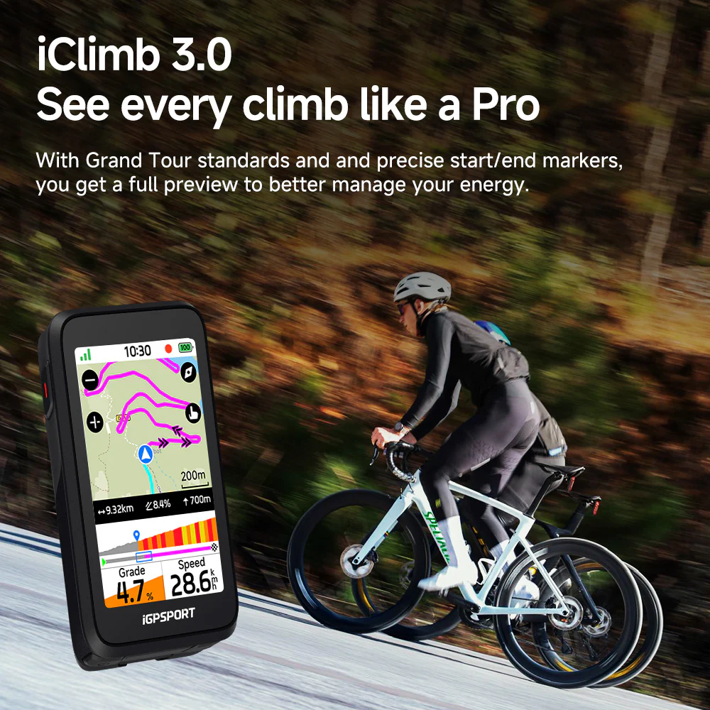 iClimb 3.0—It replicates Grand Tour climb classifications, providing a preview of the climb with an advanced elevation curve. The climb overlay on the map provides a clearer visual display, helping you manage your effort scientifically.