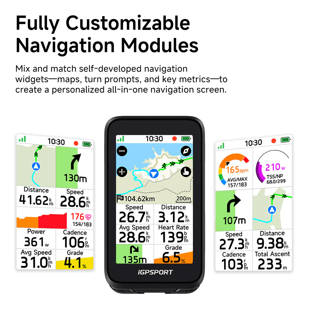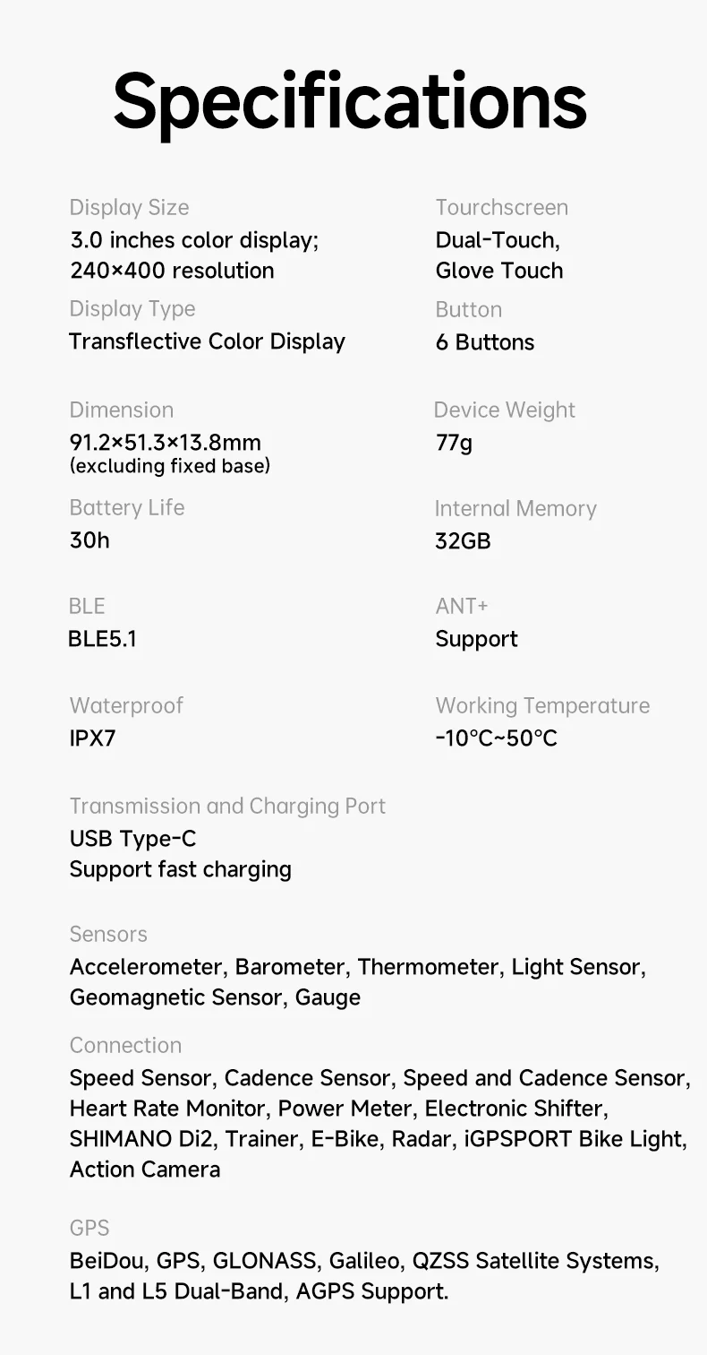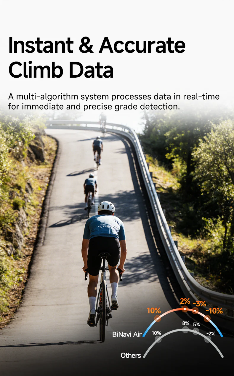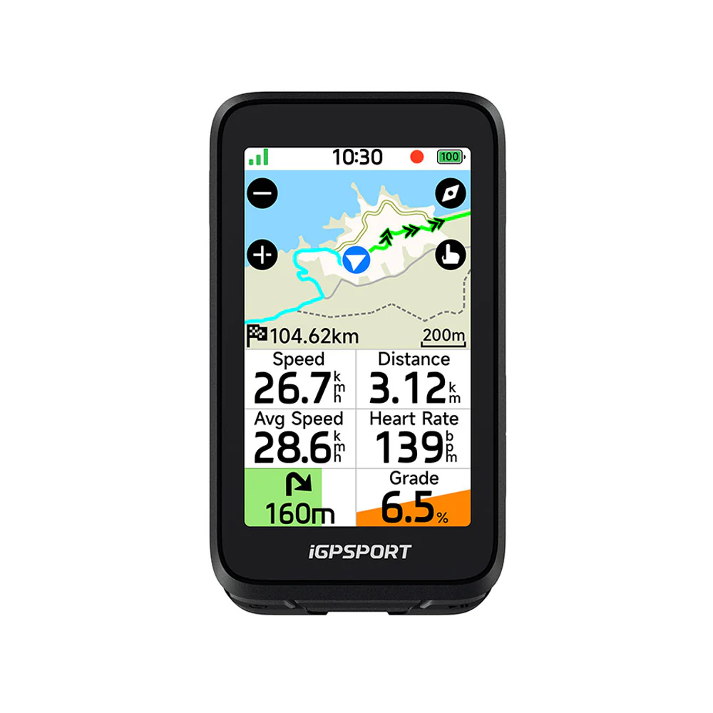 The iGPSPORT BiNavi Air bicycle computer is a lightweight, GPS-enabled cycling computer designed for navigation and performance tracking. It features a clear 3.0-inch color display, dual-band multi-GNSS positioning for accurate tracking, and built-in offline maps with turn-by-turn navigation. With up to 30 hours of battery life, wide sensor compatibility (heart rate, cadence, power), and smart features like notifications and route syncing, it’s built for both training and long-distance rides.